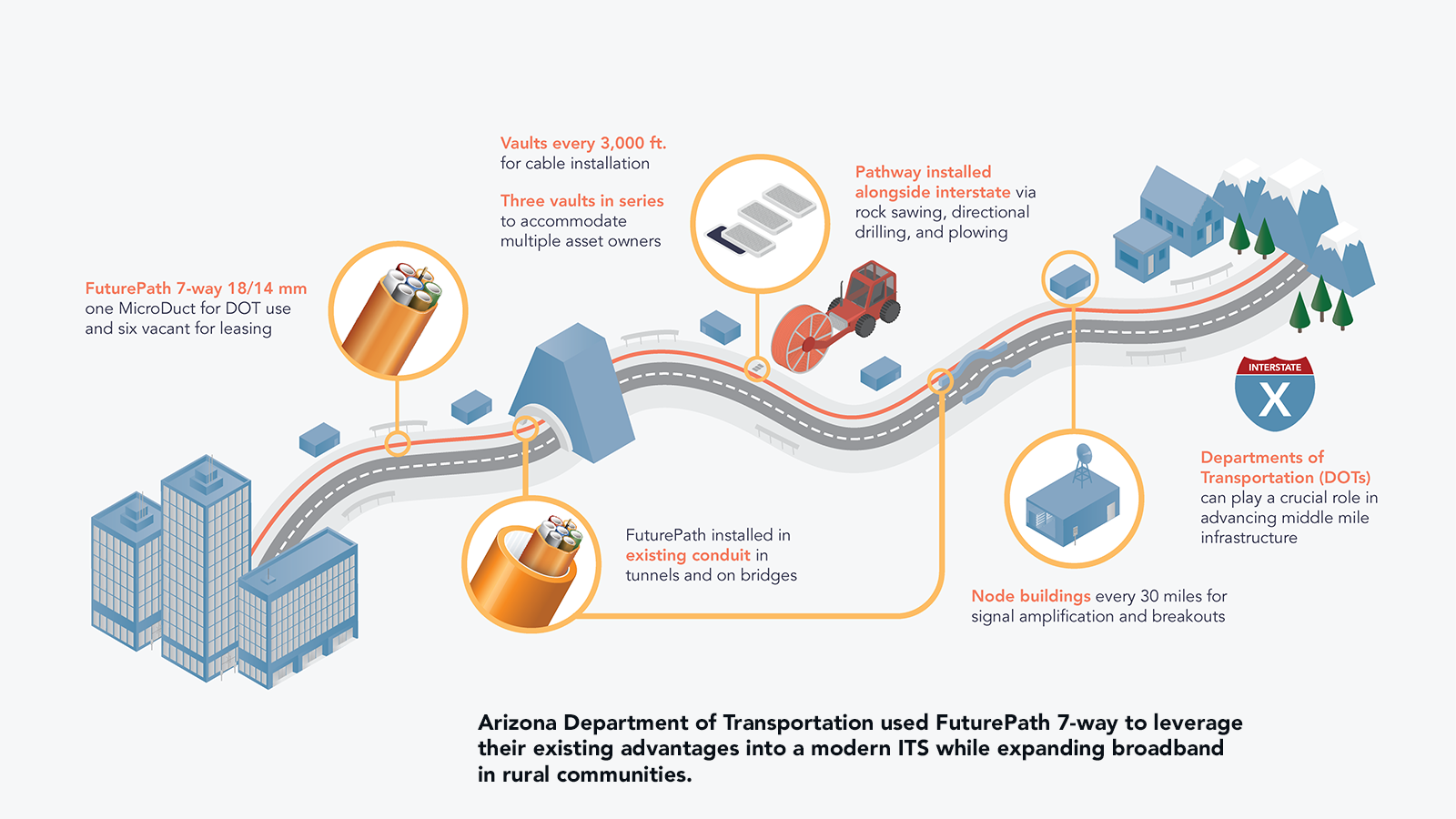 ADOT needed to overcome numerous challenges to meet their goal of delivering high-speed internet to Arizona's middle mile communities across 400 miles of conduit and fiber: rocky terrain, protected species and culturally sensitive grounds, rockfall areas, and rodent hazards -- all while minimizing disruption to road users. They chose to use horizontal directional drilling, plowing, and MicroTrenching to install FuturePath Armored 7-way along roadways as well as on existing tunnels and bridges, and routed it through an innovative triple vault to separate ADOT infrastructure from commercial partners’. These choices helped them meet their technical and commercial goals as well as saved on construction costs, and because of Armored FuturePath's robust design, ADOT’s thoughtful planning will go a long way in preventing accidental cable strikes and allowing space for future expansion and leasing.