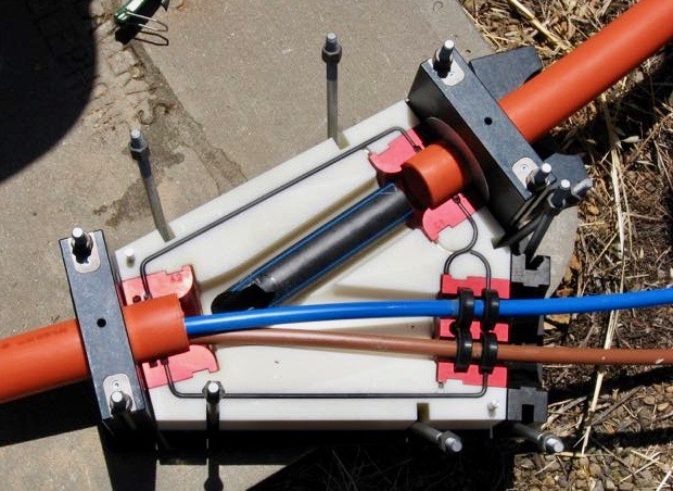 A Y-block isolates an existing cable so a conduit can be pressurized for jetting. The Y-block sits between the jetting machine and entrance to the existing conduit and all apparatus is divisible so that it can be installed around the existing cable. Always check you’re using appropriately sized seals for your conduit and cable.